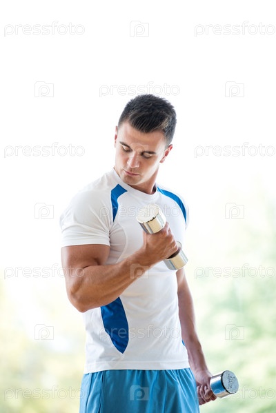 Мужчина делает упражнение с гантелями