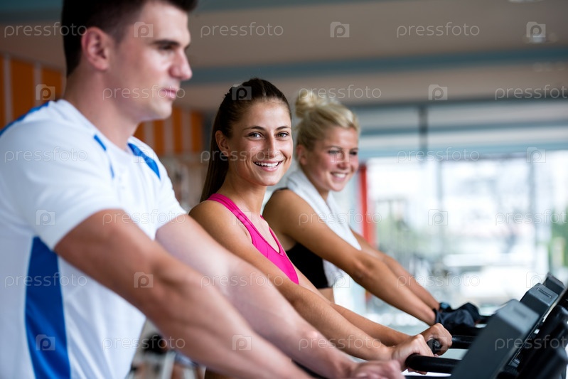 Люди делают упражнения на беговой дорожке в тренажерном зале