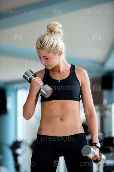 Женщина поднимает гантели в тренажерном зале