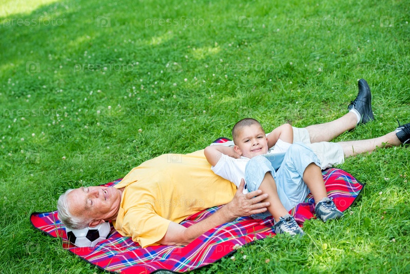 Дедушка с внуком отдыхают в парке
