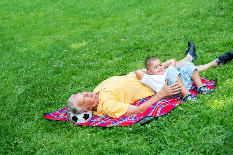 Дедушка с внуком отдыхают в парке