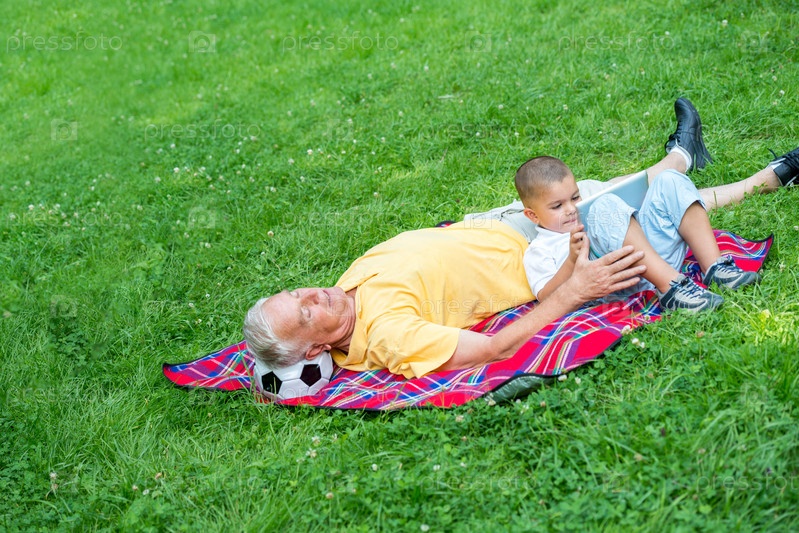 Дедушка с внуком отдыхают в парке