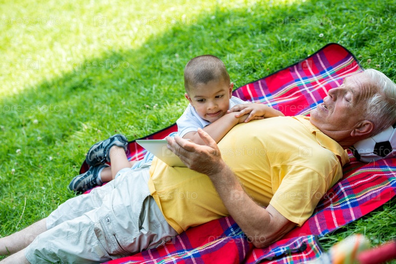 Дедушка с внуком отдыхают в парке