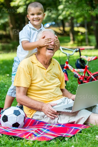 Дедушка с внуком отдыхают в парке