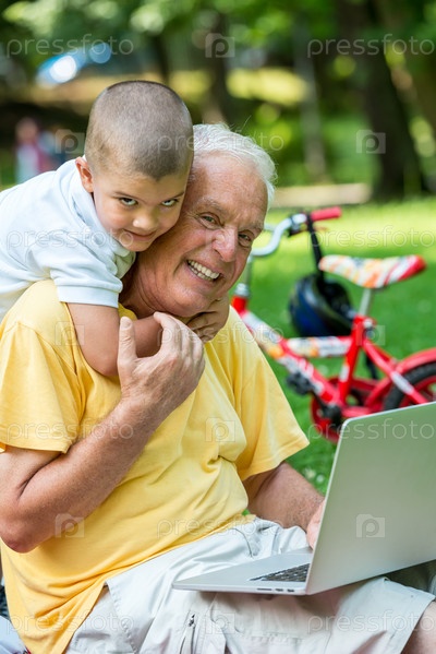 Пожилой мужчина с внуком используют ноутбук