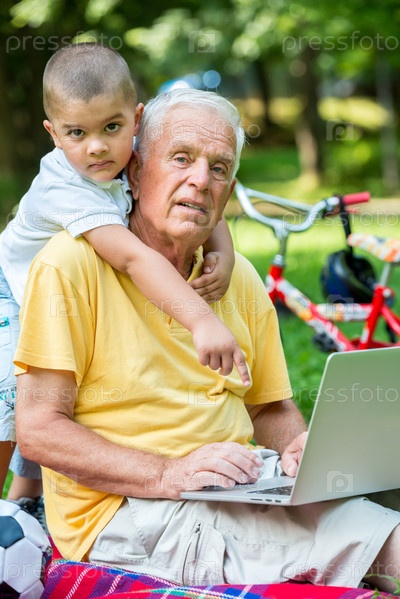 Пожилой мужчина с внуком используют ноутбук