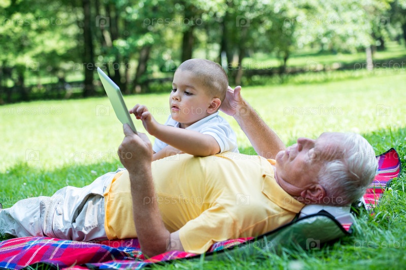 Дедушка с внуком отдыхают в парке