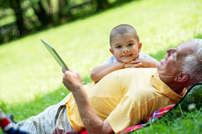 Дедушка с внуком отдыхают в парке
