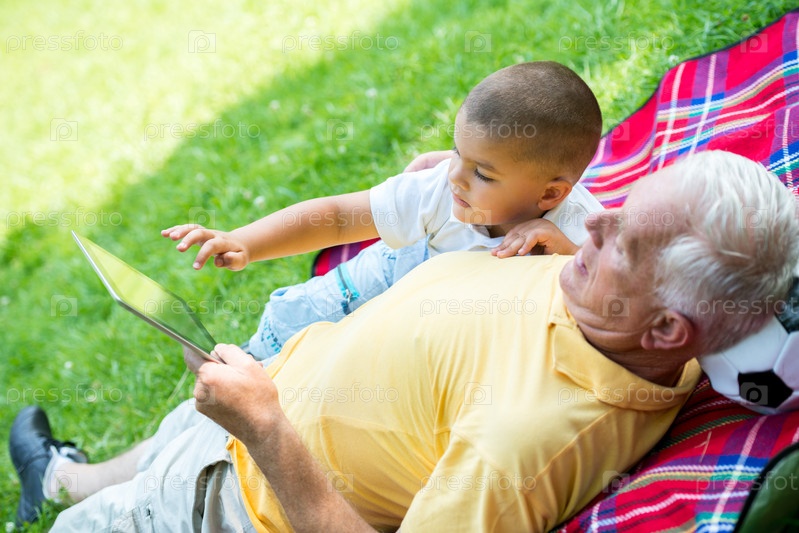 Дедушка с внуком отдыхают в парке