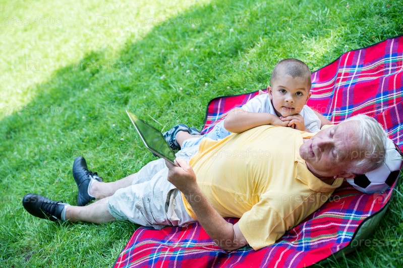 Дедушка с внуком отдыхают в парке