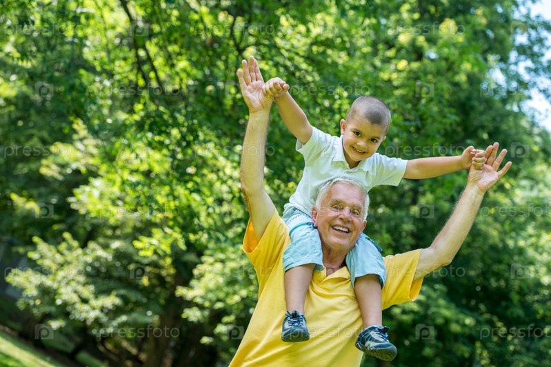 Дедушка с внуком отдыхают в парке