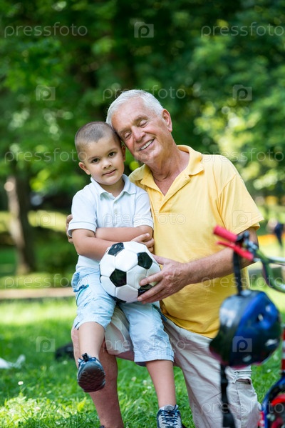 Дедушка с внуком отдыхают в парке