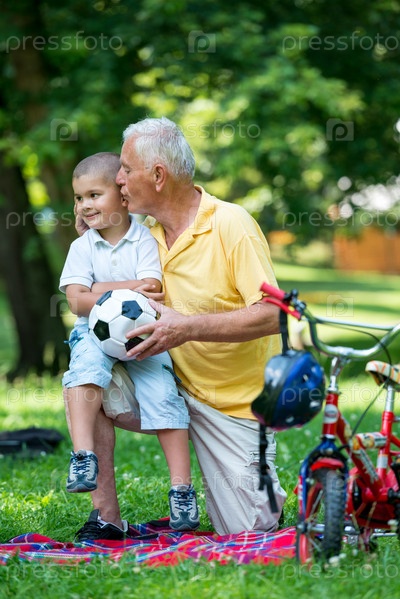 Дедушка с внуком отдыхают в парке