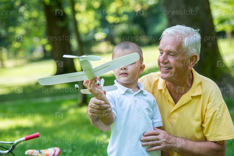 Дедушка с внуком отдыхают в парке
