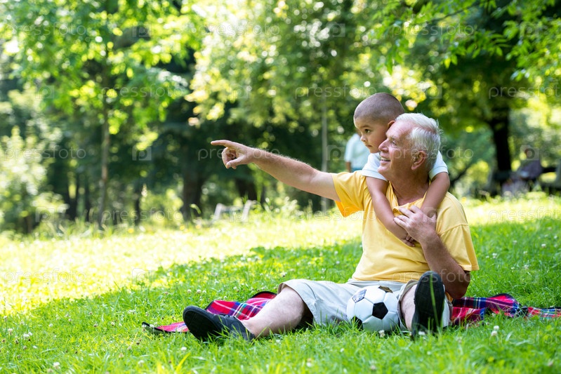 Дедушка с внуком отдыхают в парке
