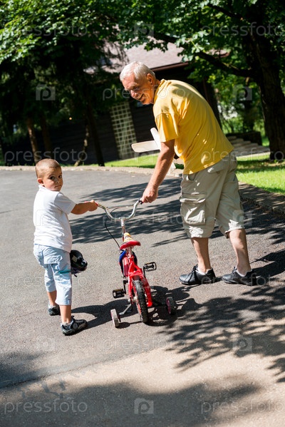 Дедушка с внуком отдыхают в парке