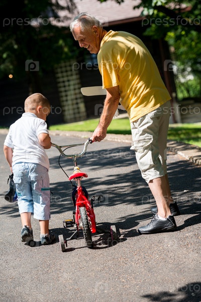 Дедушка с внуком отдыхают в парке
