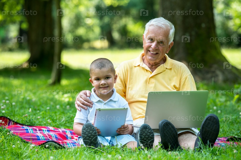 Дедушка с внуком отдыхают в парке