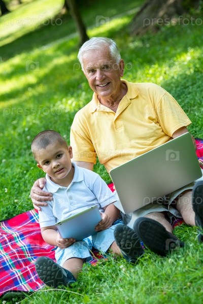 Дедушка с внуком отдыхают в парке