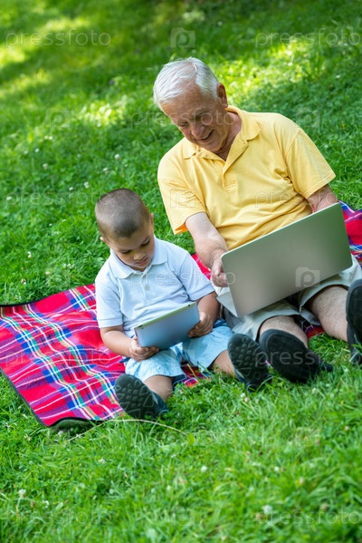 Дедушка с внуком отдыхают в парке