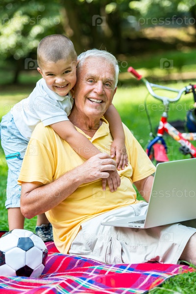 Дедушка с внуком отдыхают в парке
