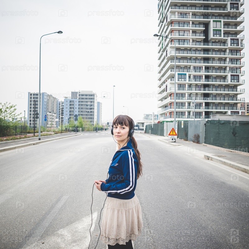 Красивая женщина в наушниках на пустыре