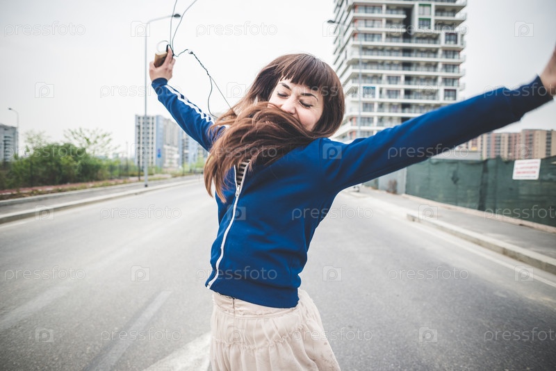 Красивая женщина в наушниках на пустыре
