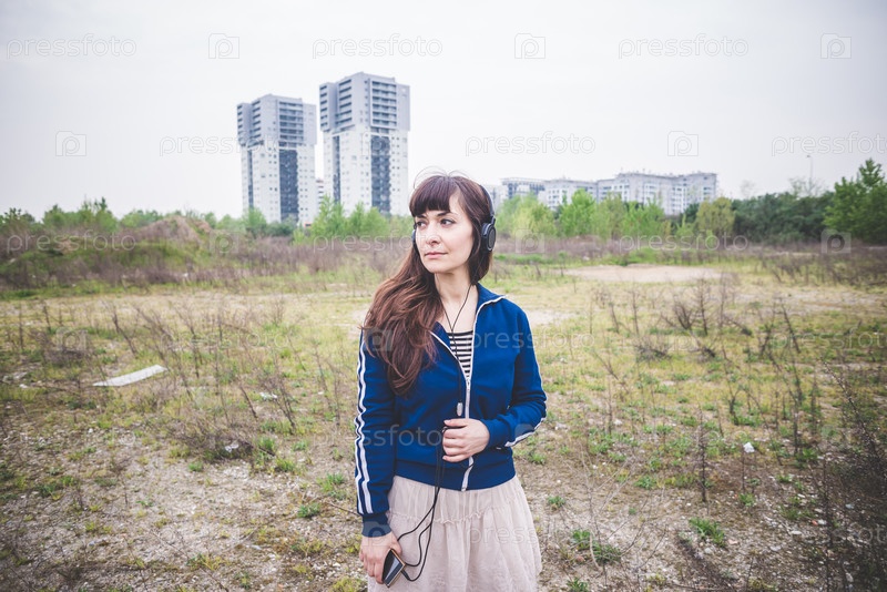 Красивая женщина в наушниках на пустыре