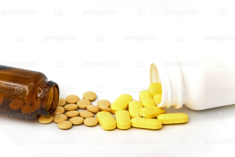Таблетки, рассыпанные из пузырьков на белом фоне