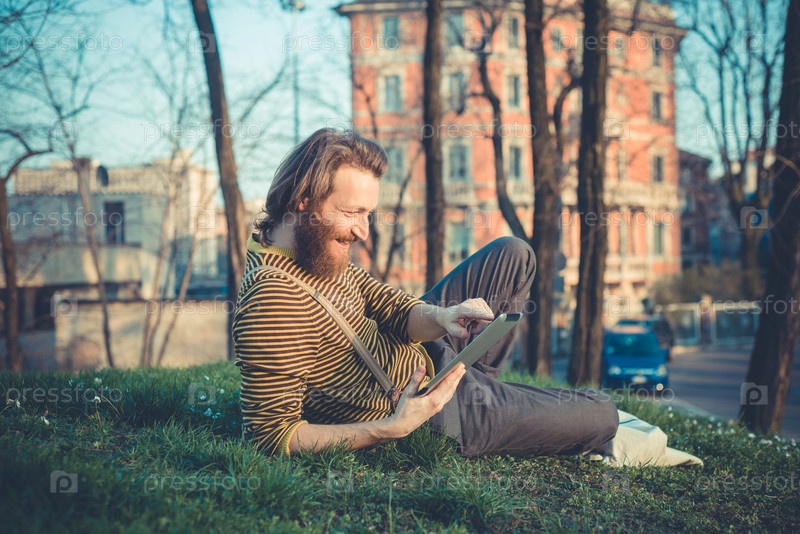 Молодой бородатый стильный мужчина с планшетом