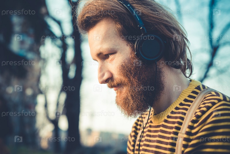 Молодой бородатый мужчина слушает музыку