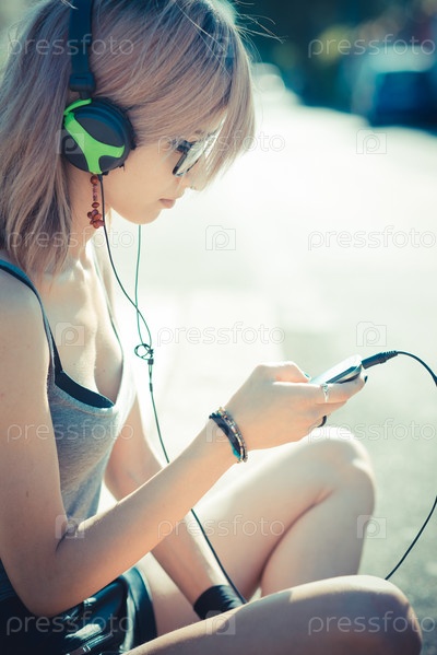 Молодая красивая женщина слушает музыку