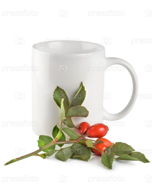 Ветка шиповника и чашка с чаем на белом фоне