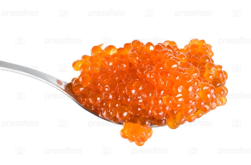 Ложка с красной икрой на белом фоне