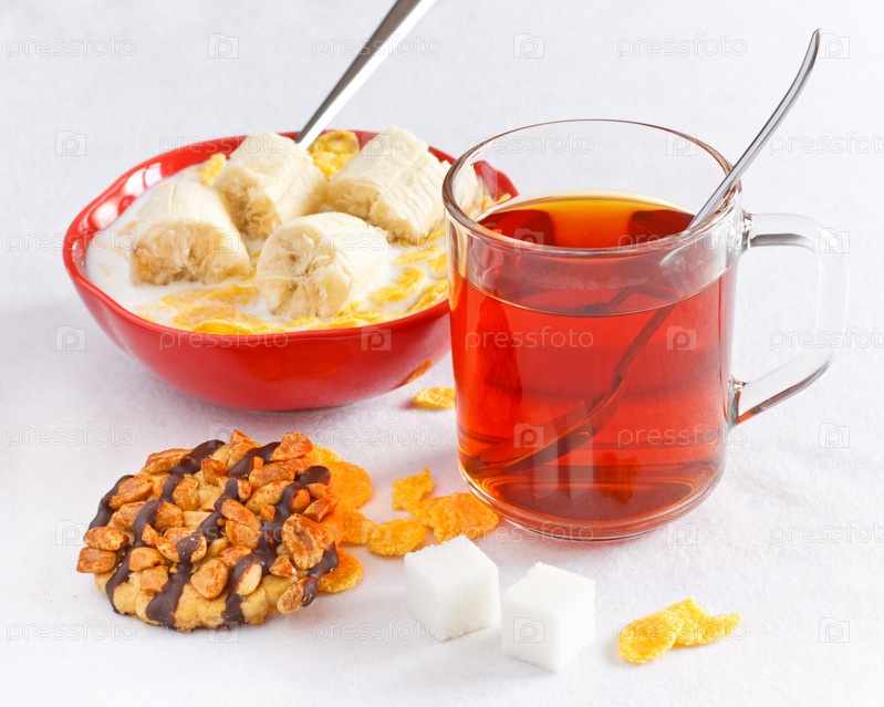 Кукурузные хлопья с бананом и чай с печеньем