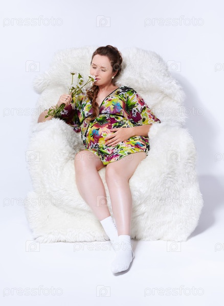 Портрет молодой беременной женщины в белом пушистом кресле с букетом ромашек