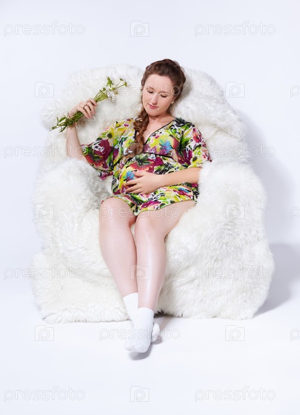 Портрет молодой беременной женщины в белом пушистом кресле с букетом ромашек