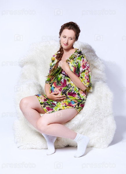 Портрет молодой беременной женщины в белом пушистом кресле с букетом ромашек