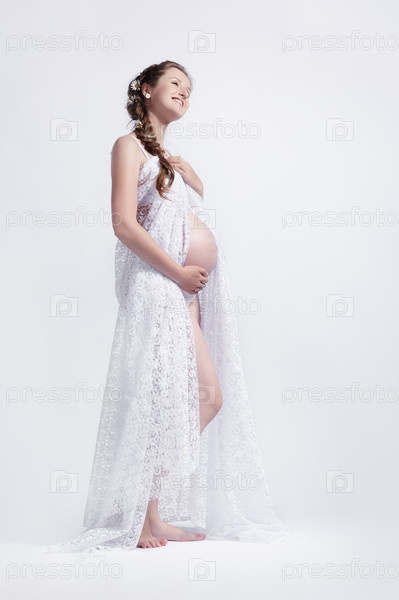Портрет молодой беременной женщины в белом
