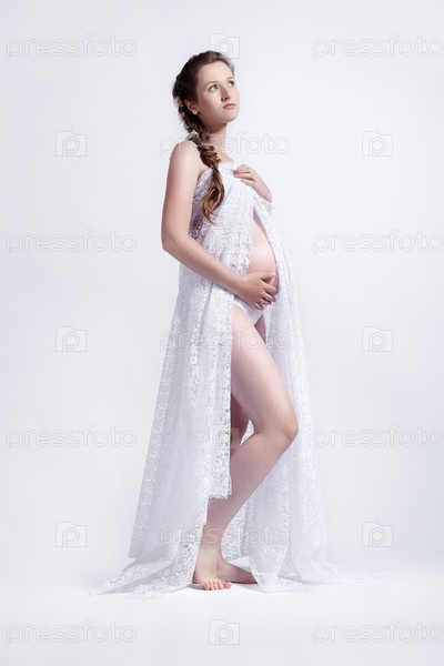 Полнометражный портрет молодой красивой беременной женщины касаясь ее живота