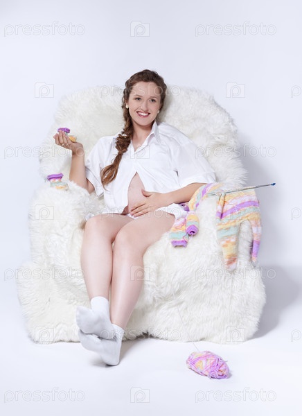Молодая беременная женщина вяжет малышу, сидя в белом пушистом кресле