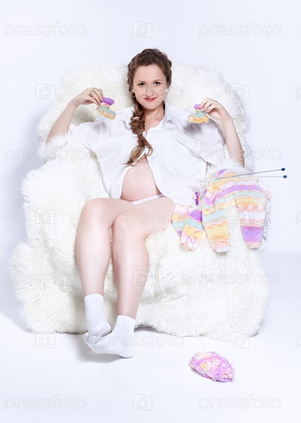 Молодая беременная женщина вяжет малышу, сидя в белом пушистом кресле