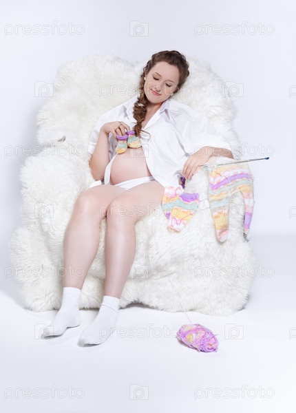 Молодая беременная женщина вяжет малышу, сидя в белом пушистом кресле