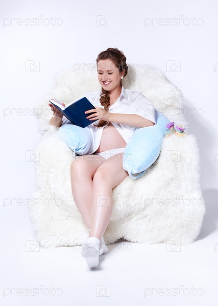 Беременная женщина читает книгу, сидя в белом пушистом кресле