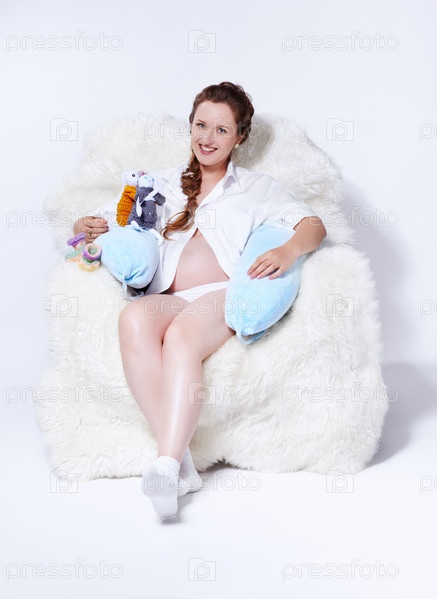 Портрет молодой беременной женщины с двумя игрушечными зайцами, сидящей в белом пушистом кресле