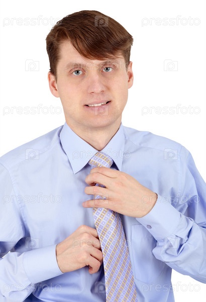 Один молодой человек устраивает свой галстук на белом фоне