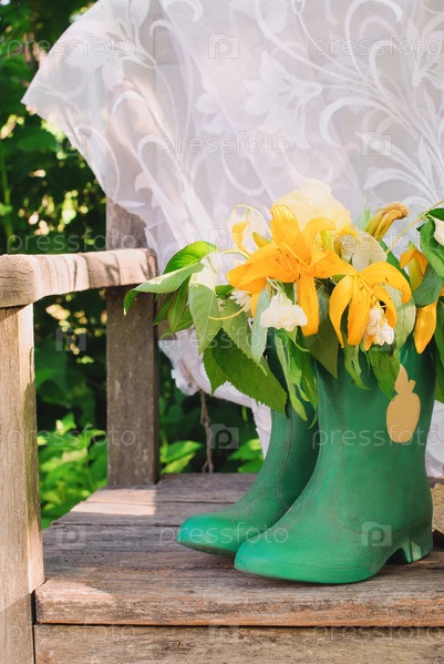 Зеленый резиновый сапог желтого цветочного кресла «Натюрморт» летом