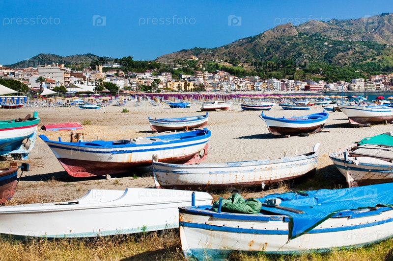 Лодки на городском пляже Гардини Наксос в летний день, Сицилия, Италия