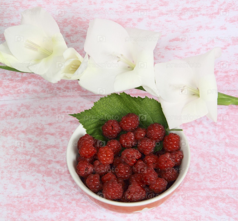 Малина в чашке и белые цветы