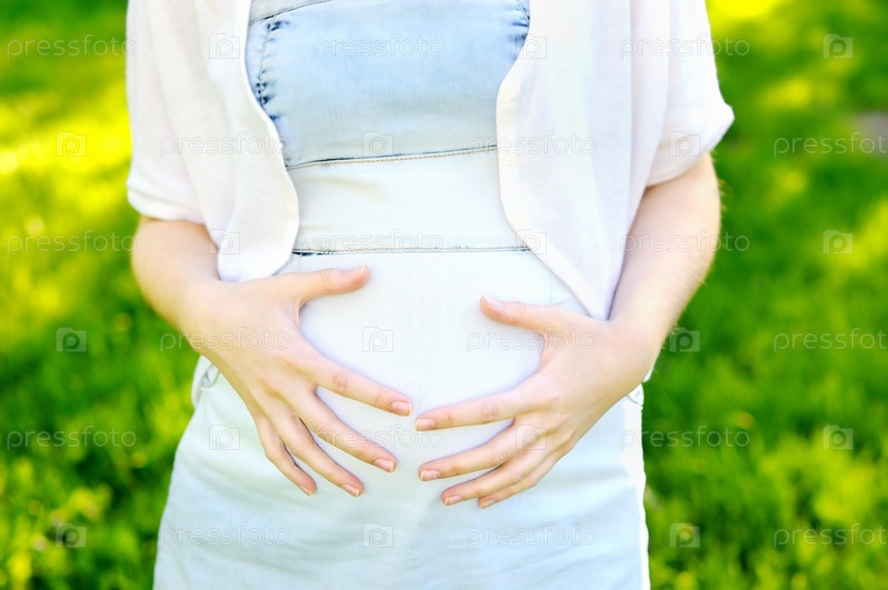 Беременная женщина крупным планом на фоне зеленой лужайки